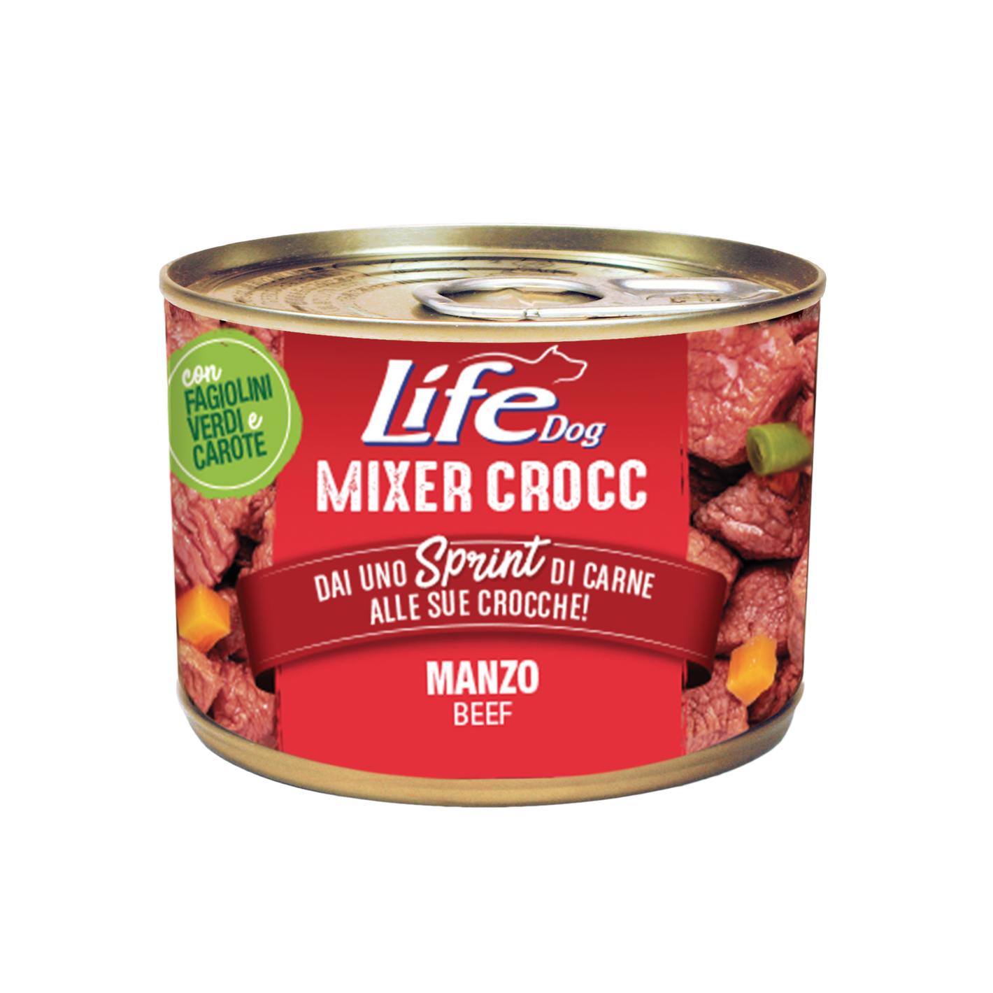 INGREDIENTI: Manzo (45%), Fagiolini verdi (7,5%), Carote (7,5%), Amido di tapioca