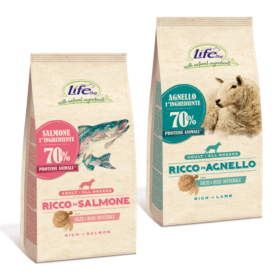 Tutti gli alimenti secchiLife Natural, sono fatti seguendo una regola fondamentale: il primo ingrediente è sempre carne o pesce di alta qualità . Questo per offrire un apporto nutritivo funzionale alle reali esigenze del cane, ovvero quelle di uncarnivoro.