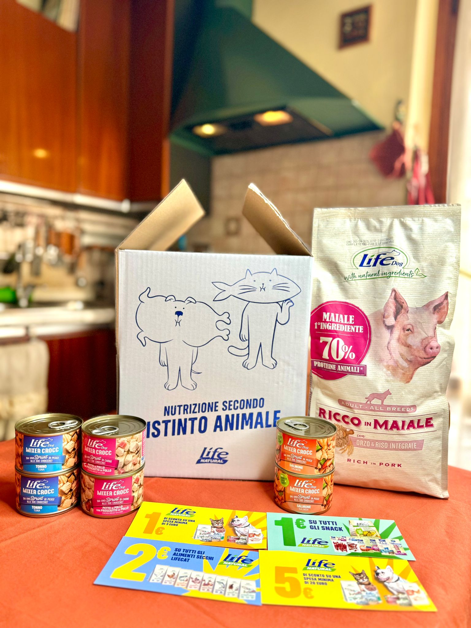 Prova il box umido/secco cane. All'interno troverai l'umido naturale mixer crocc da 150 grammi, più i nostri croccantini per cani. Inoltre, all'interno del box sono presenti dei buoni sconto da spendere nei negozi.